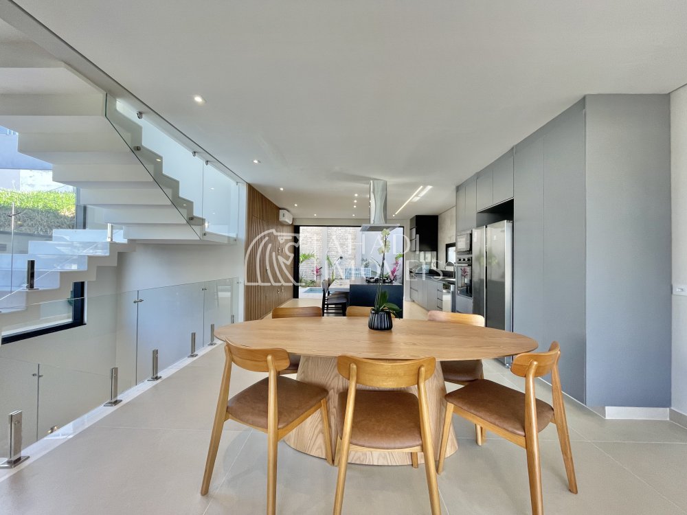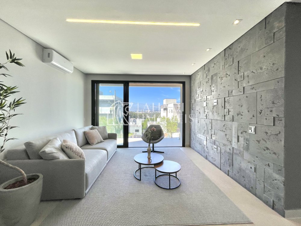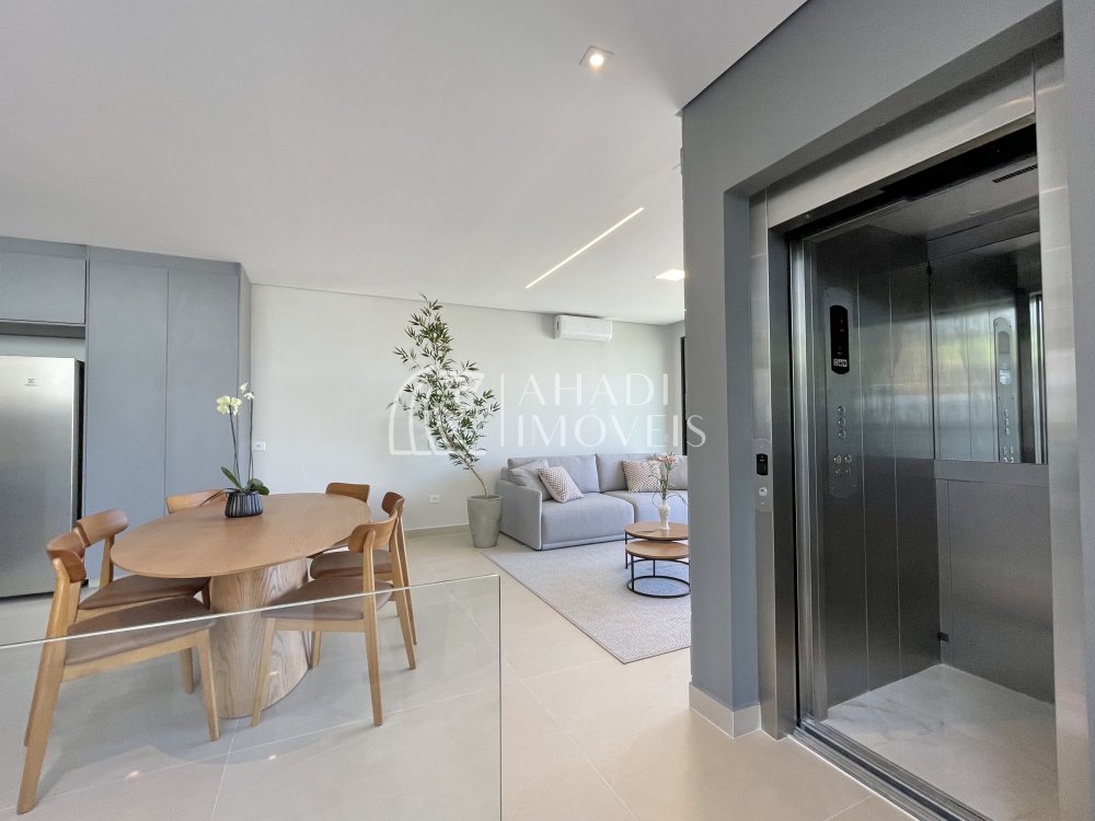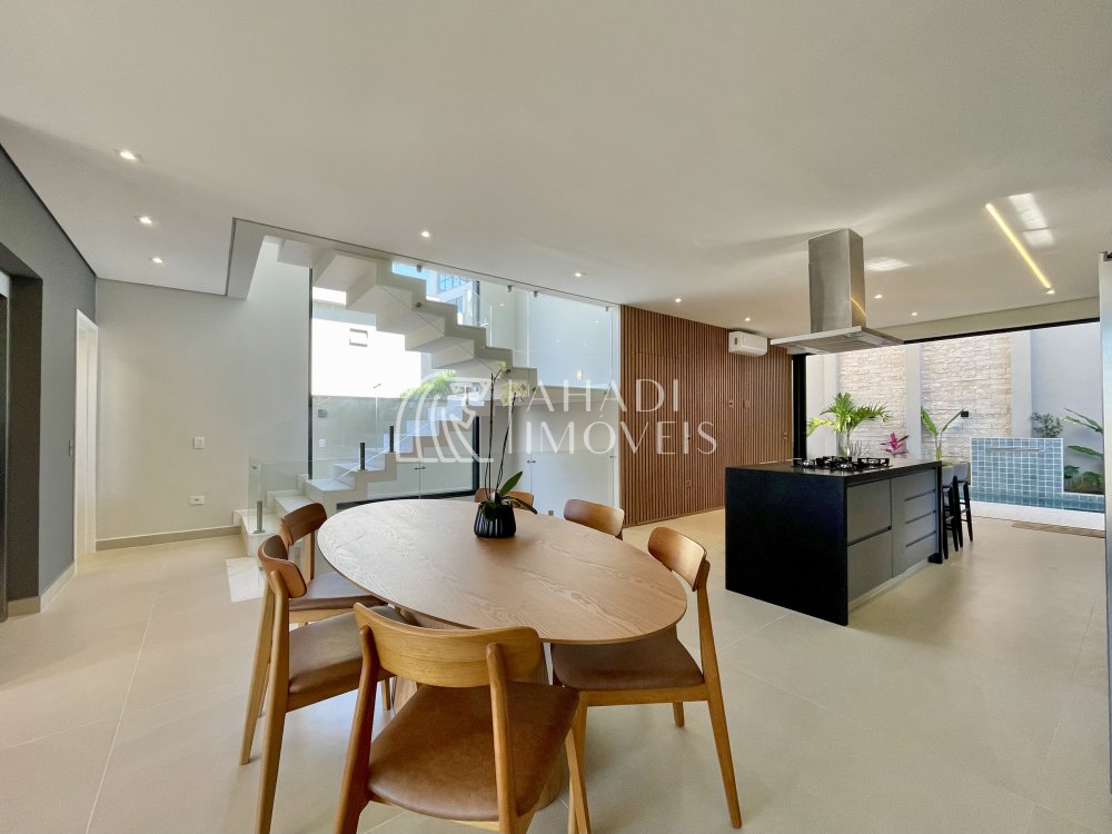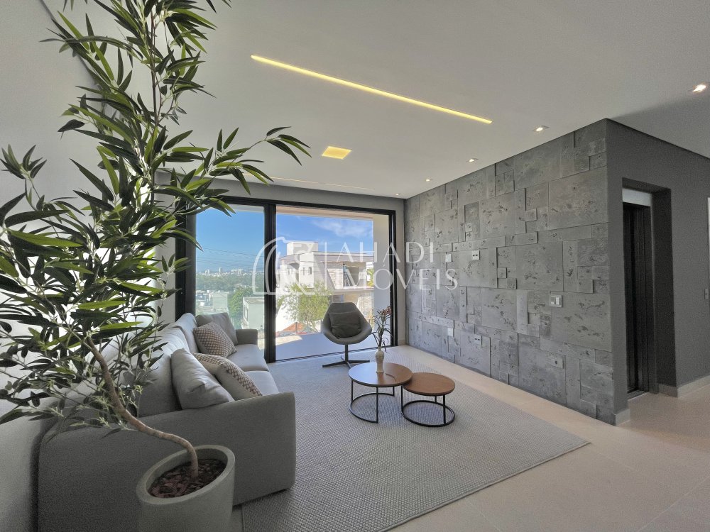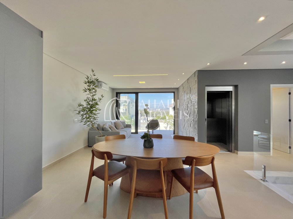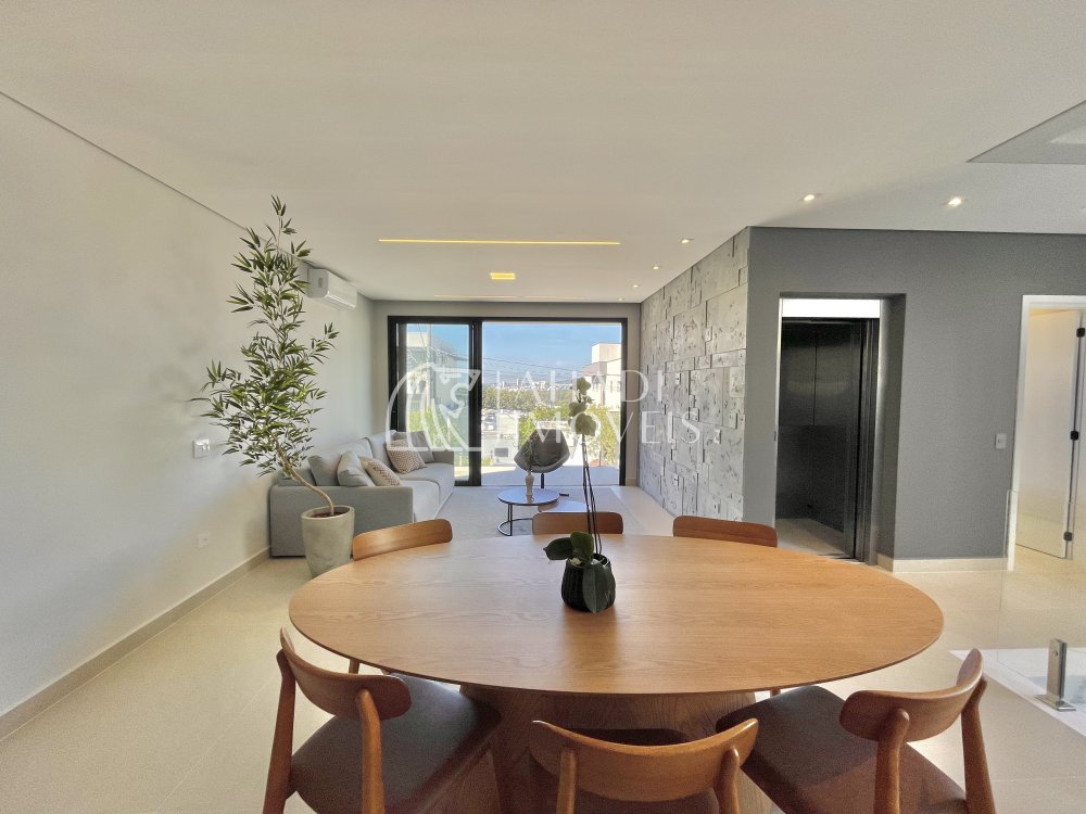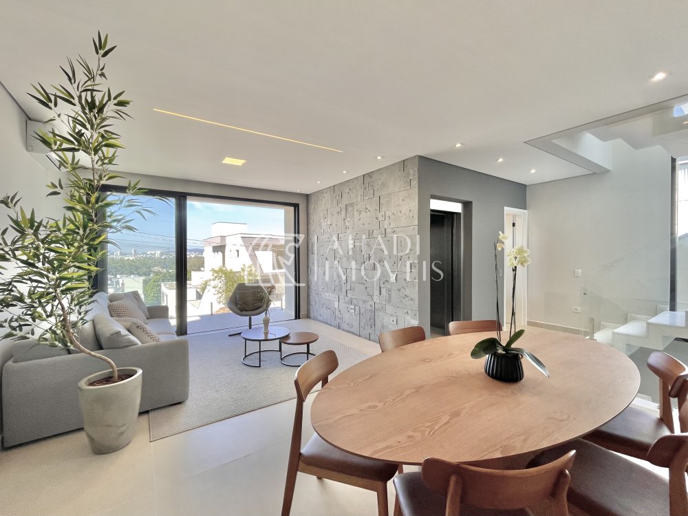 O imóvel conta com 4 suítes, sendo uma no pavimento térreo, além de escritório e elevador que atende os três pavimentos, garantindo acessibilidade e praticidade no dia a dia. Os ambientes são totalmente climatizados e o pavimento principal é entregue mobiliado, planejado e decorado.
