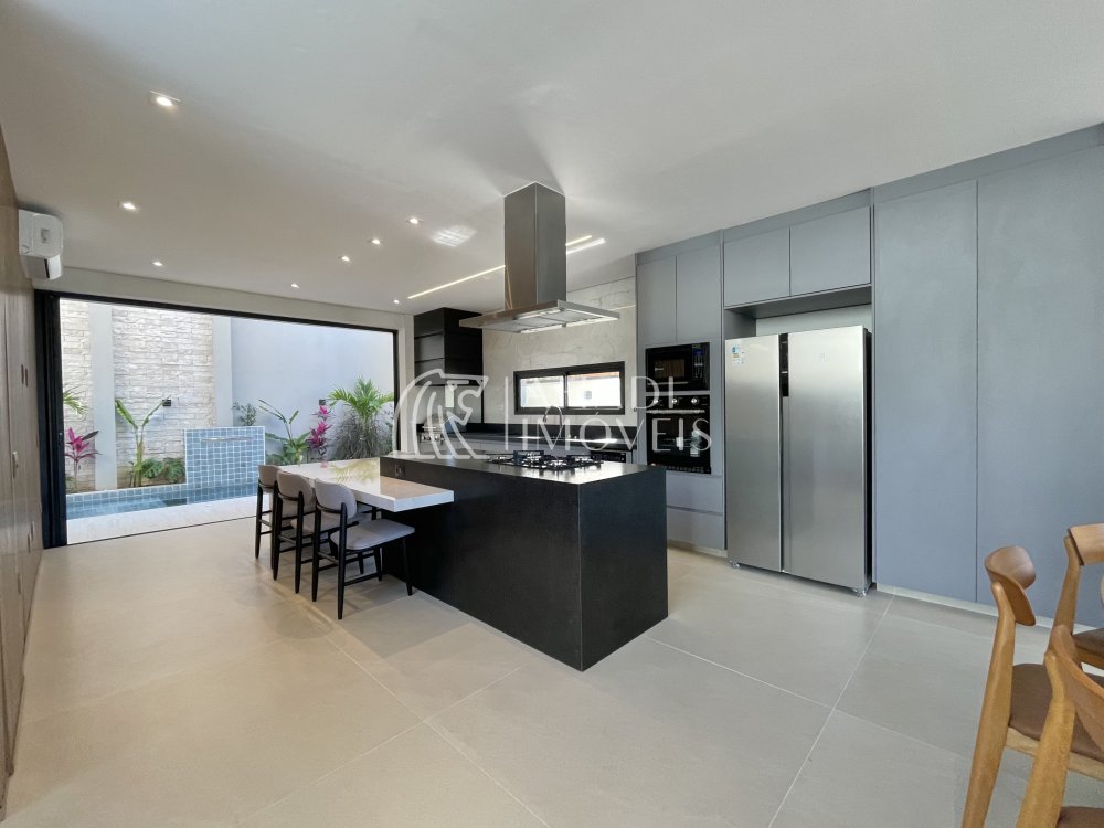 A área social integra uma cozinha completa, equipada com todos os eletrodomésticos, e se conecta à área externa com piscina e cascata, ideal para momentos de lazer.